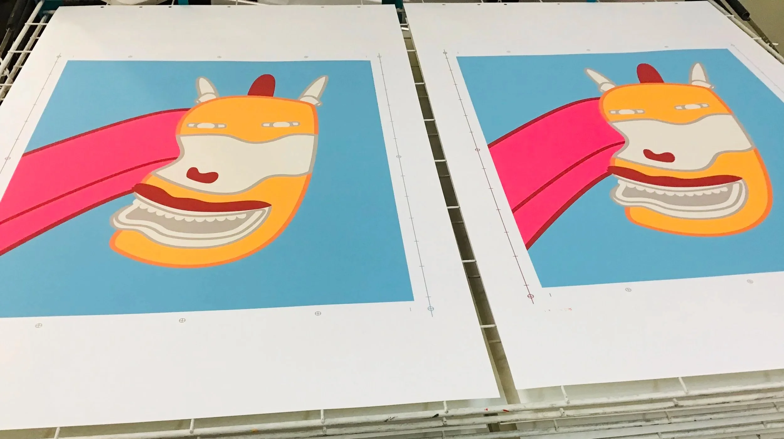 Screenprints are created one color at a time, with a new screen for each layer of color applied. Translating Wirsum’s idiosyncratic color palette tested POP!NK’s printmaking mettle.